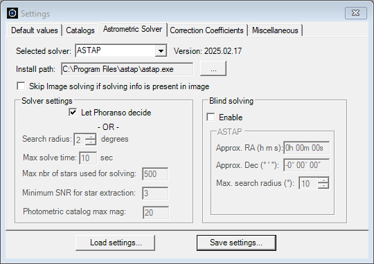 - If you select the ASTAP solver, you have to make sure to first install the ASTAP solver by downloading it from the ASTAP website. Follow the installation instructions provided on the website. Then click the Phoranso button with the 3 dots to indicate the location (Install path) of the ASTAP executable on your hard drive.