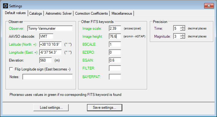 Some of this information may be present as Keywords in the FITS Header of your FITS images. If that's the case, Phoranso will give preference to the Keyword in the FITS Header. This applies to all Default values parameters marked in green color.