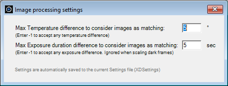 - It allows to set the Max temperature difference (tolerance) and the Max Exposure duration difference to consider master frames to be matching with a Science image. Entering a value of 0 will reject any tolerance, i.e. only perfect matches are accepted. Entering a value of -1 will accept any tolerance.