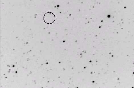 the Palomar prints. On 2001, October 31.8132 UT, Chris Jones (UK) reported his visual detection of an outburst of the object, and estimated it at mag 14.0 (vsnet-outburst 3022). I had an unfiltered CCD session of TK4 at CBA Belgium Observatory on 2001, November 1/2, between 17h00m UT and 18h01m UT (i.e. Nov 1.708 and Nov 1.750 UT). I used a 0.35-m f/6.3 reflector and SBIG ST-7 CCD. At left is a "stacked" CCD image (10 x 30 sec exposure) showing the TK4 region. |