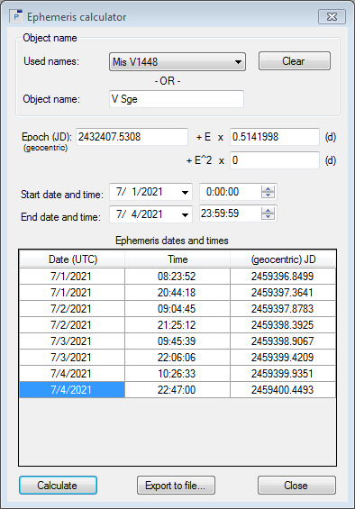 - Epoch (JD): to calculate an ephemeris, you need to know the (geocentric) Julian date of the reference epoch, as well the orbital period of the system and (optional) secondary terms. These values can be found in literature. For V Sge, we enter 2,432,407.5308 as reference epoch in the Epoch (JD) field. The orbital period is 0.5141998 days, which we enter in the E field. We don't know the secondary terms, so we leave the E^2 value to 0.