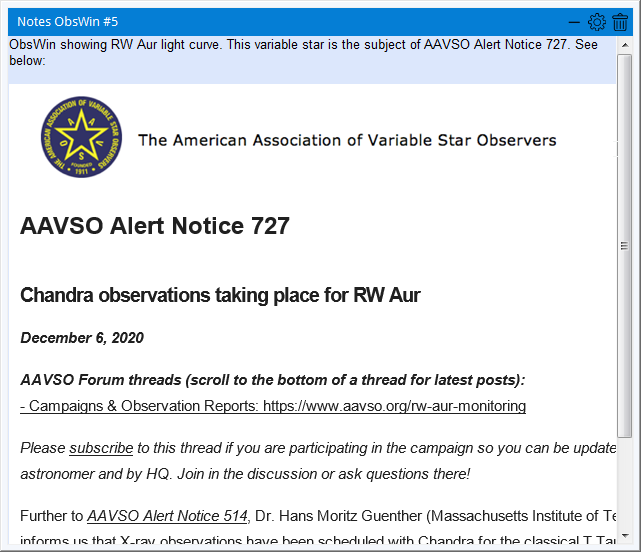 Example of a Notes form with a combination of text and a screenshot of AAVSO Alert Notice 727