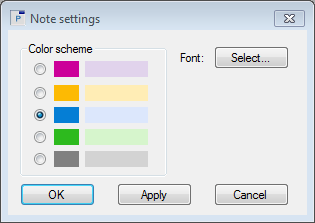 is used to bring up the Note settings dialog box, which allows to select the Color scheme of the Notes form (controlling the color of the title bar and form background) and the Font of the Notes text.