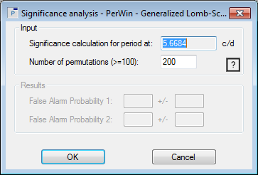 As a rule of thumb: FAPs below 0.01 (1%) mostly indicate very secure periods, and those between 0.01 and 0.20 are far less certain. Anything above 0.20 (20%) mostly relates to an artifact in your data, instead of a true period. Peranso displays the Period Significance Analysis dialog box to determine the significance of a period P. A full description of the dialog box is provided in Tutorial 3.