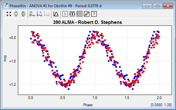 The label [0.5880, 1.28] in the lower right part displays the mouse coordinates (phase, mag). The toolbar in the upper part of the Phase Window groups frequently used PhaseWin commands. Almost all graphical properties of a PhaseWin can be modified by the user. This includes axes titles, the mouse coordinates label, the PhaseWin title, and so on. Left click the mouse on the label of interest to modify the label text. Right click to change the font and color. |