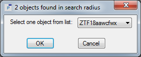 - Peranso will inform you that 4 ZTF objects where found in the search radius, and will offer you a selection box in which you have to pick the first one ZTF18aawcfwx. The object names use the ZTF naming convention. Click OK.