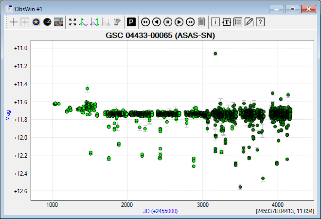 - This loads the contents of the file and creates an Observations Window (ObsWin) with as caption GSC 04433-00065 ASAS-SN. ASAS-SN observations are made with V and g filters. Peranso groups all V observations in one Observation Set, and all g observations in another Observation Set. Your ObsWin hence contains two Observation Sets with a total of 3806 observations.