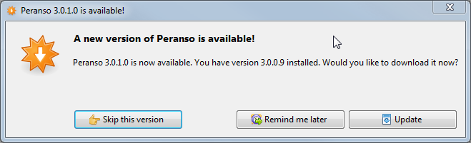 Software updates enhance the functionality of Peranso through new features and improvements. They are published throughout the year. We strongly encourage you to install updates as soon as they are available. The Peranso website has a Revision history section, explaining the new features and improvements of the update. Software updates are available free-of-charge to all Peranso users during the Registration Key Validity period. If your Registration Key has expired, you can continue to use Peranso but you will not be able to install updates, nor to receive technical support. Peranso users with a valid Registration Key will be automatically notified if a new Peranso release is available for download, upon starting Peranso. If your Registration Key has expired, you will not be notified. Notification happens through the following message box: